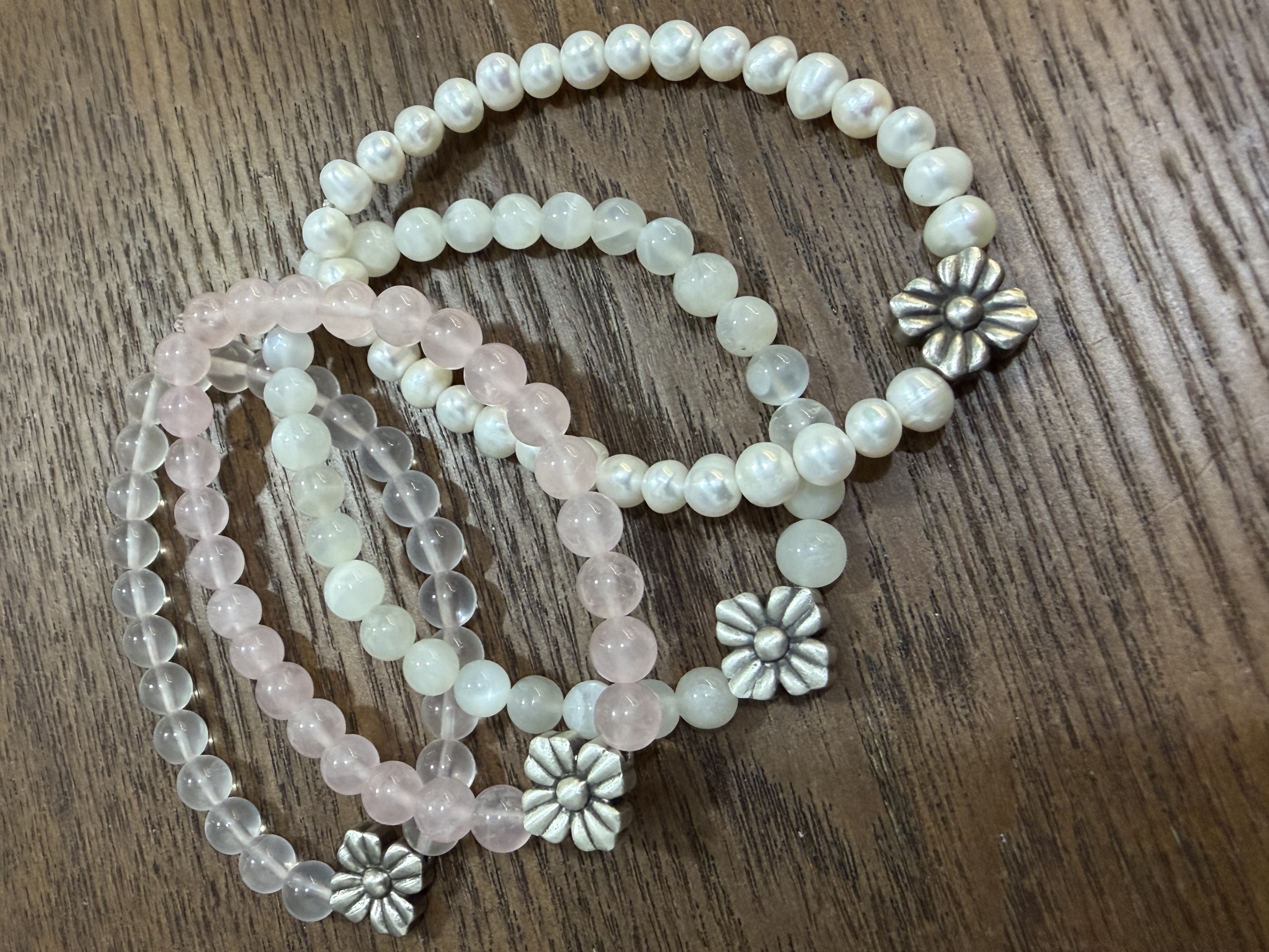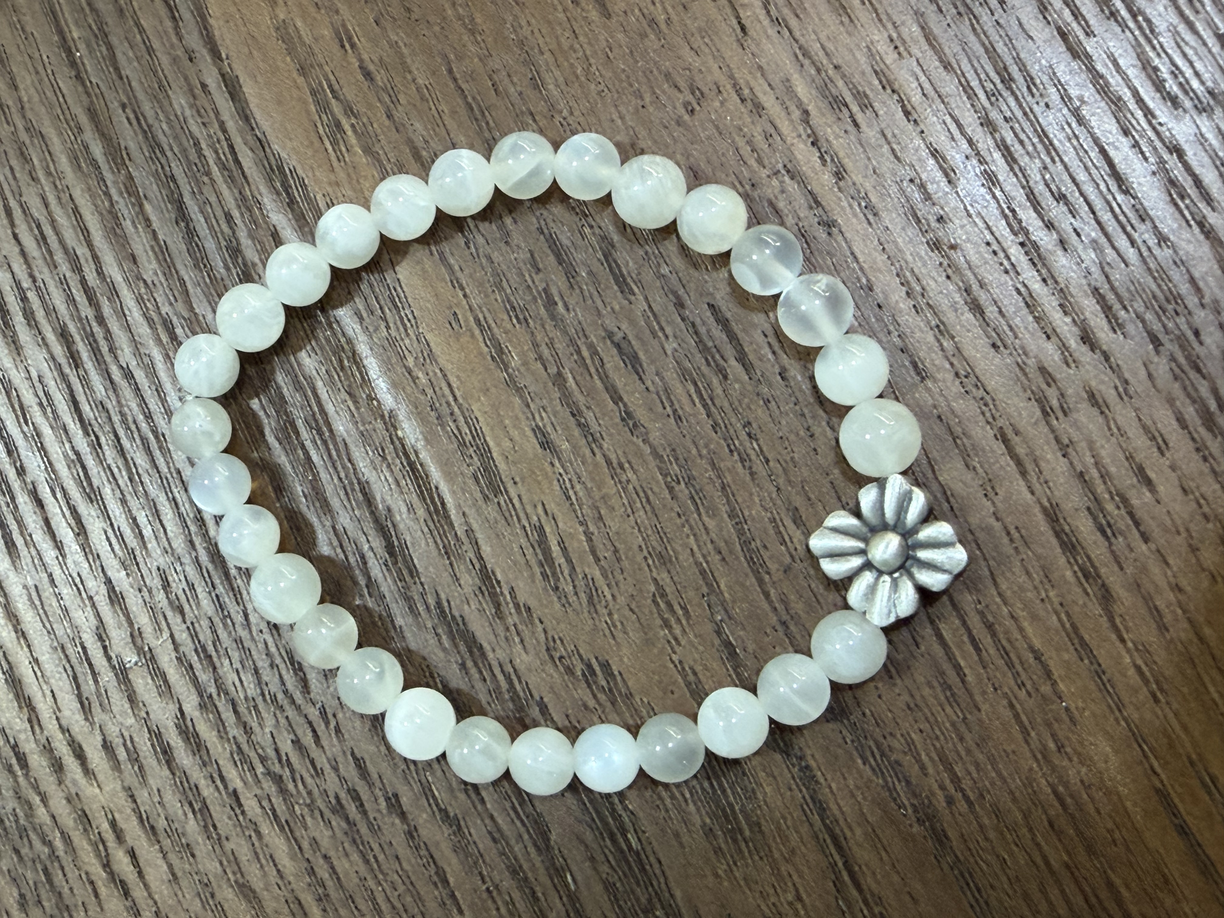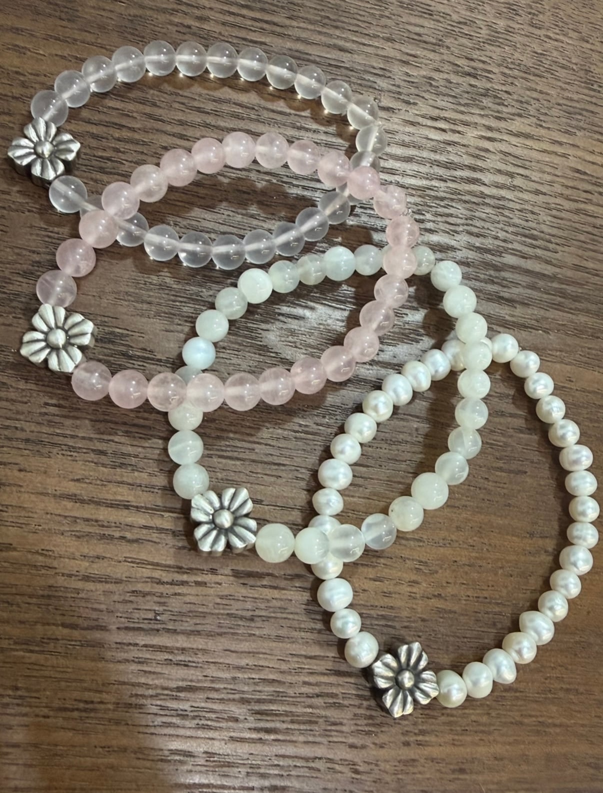 “ 願這朵在中心站穩的銀花🌼, 與它周圍的默默守護, 成為你腕間最安靜的陪伴、 最溫柔的錨點。“ --- ▎設計哲學 — 在搖晃的世界裡,為自己定錨✨ - 中央銀花 — 你的初心與獨特靈魂,永不凋零 - 天然石環繞 — 大地贈予的溫能量防護網 材質:月光石, 冰粉晶, 粉晶, 淡水珍珠 尺寸 :16/17/18/19/20/21cm(建議選比手腕圍大1.5-2cm)