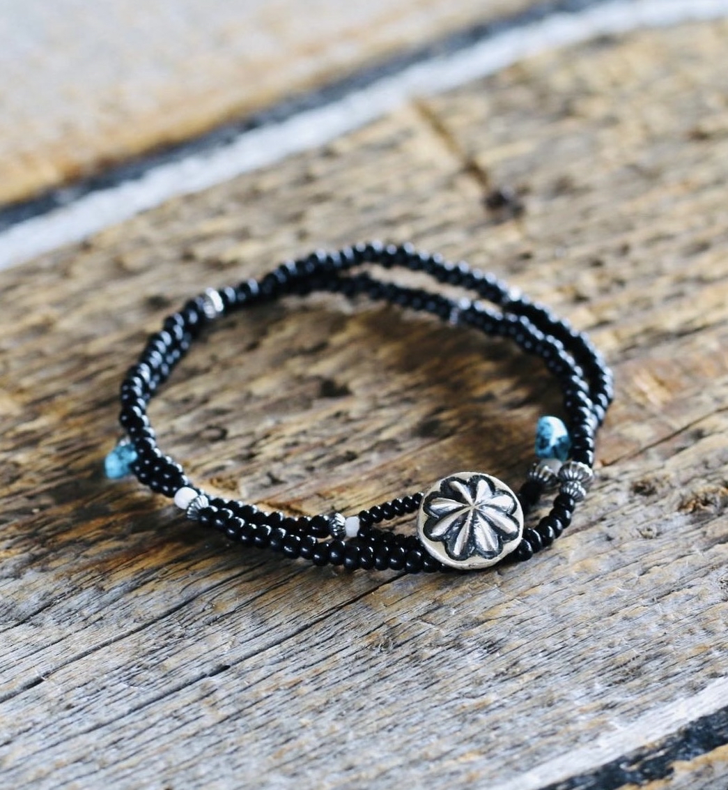 帶有神秘美麗的黑色,配上Kingman 綠松石 和 特色銀珠 而成的手鏈。置中位置 配上Kazoo 原創的阿波羅銀飾。 尺寸 S... 14.5-15.5cm 手腕合適 M... 15.5-16.5cm 手腕合適 L... 16.5-17.5cm 手腕合適 材質: 捷克琉璃種子珠,SV925銀,Kingman 綠松石 Handmade In Japan 購買需知/ Purchase Notice... ⚠️手工製品 製作需時... 生產工期2-4星期 Handmade products, takes time to make... production period 2-4weeks... 🫴來自日本🇯🇵山梨縣的手工串珠&銀飾品牌Kazoo…主理人櫻井和已 作品主要 使用SV925手工銀飾,捷克🇨🇿種子珠 & 🇮🇹 威尼斯琉璃珠 和 美國🇺🇸 Kingman 綠松石,其充滿特式的可愛細節 和 美麗色彩的珠子極具吸引力皮革製品皆由優質🦌鹿皮製作,這是柔軟溫暖的獨特質地。 他們著眼於季節感 和 平衡感,在追求設計的同時開發描繪獨特的世界🌏。他們正在生產不受現有珠子產品約束的獨特產品✨ Kazoo 主理人 與 dear blossom主理人 是好朋友,因此Kazoo 使用的銀器部分都是委由好朋友Dear Blossom 的松井直毅代為製作。